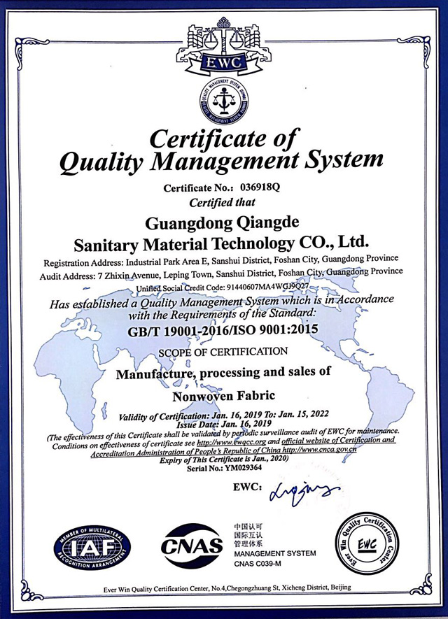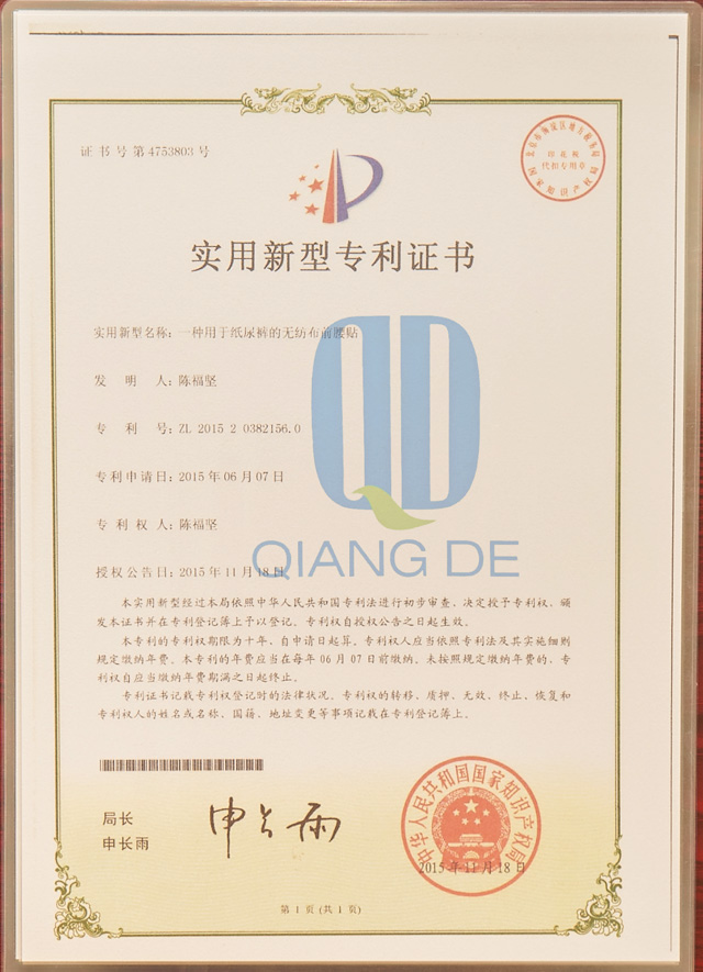 广东强的卫材科技有限公司是中国最大无纺布压花打孔及专利复合弹性无纺布制造商之一,在无纺布压花打孔卫材应用市场具备行业领导地位并获得国家高新技术企业称号。公司前身佛山强的无纺布科技有限公司成立于2007年,公司在佛山市三水区乐平镇拥有占地40亩,建筑面积5万平方卫生材料生产基地。公司已获得并列双组份(AB螺旋棉)等15项专利授权,年产打孔压花无纺布12000吨,其中纺粘线2条,热风线3条,压花打孔线36条,自主研发专利复合弹性无纺布生产线6条,产品广泛应用于婴儿尿片、妇女卫生巾、成人尿裤和口罩弹性耳带等产品。